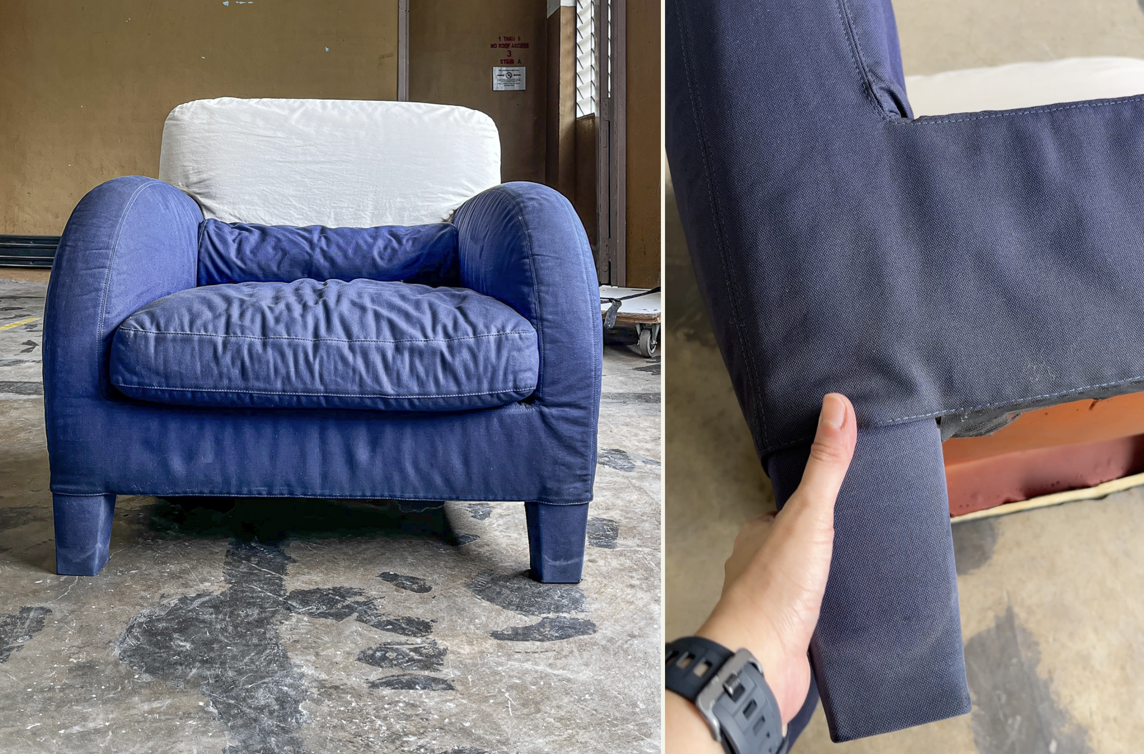 The armchair's original fabric was a smooth, denim coloured blue with a white protective cover on the back.