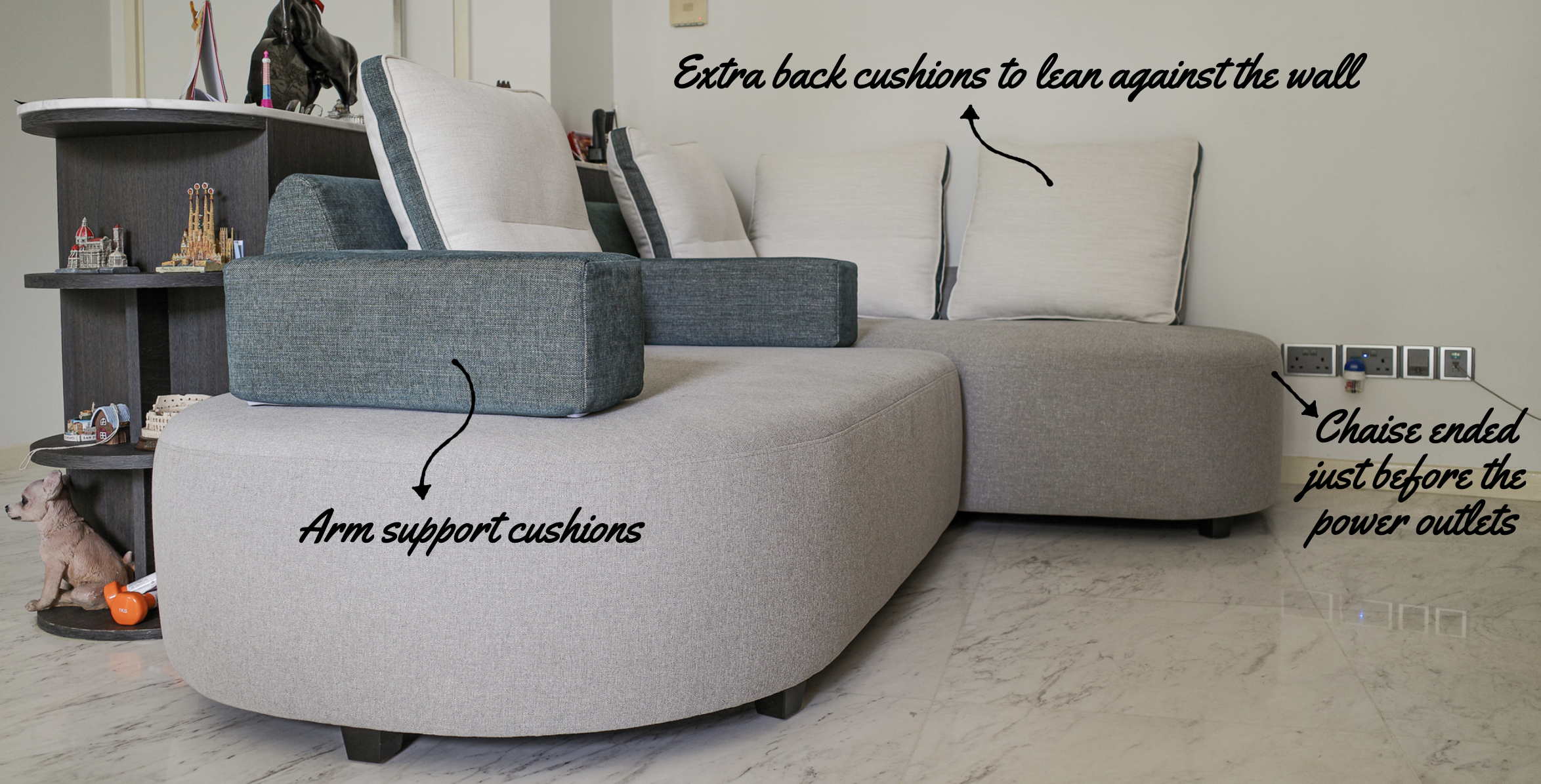 We advised against a fixed backrest for the sofa and proposed a more flexible solution of two movable, weighted backrests paired with 58cm-tall back cushions. The tall back cushion may have looked unconventional, but it offered more back support and a built-in lumbar section for comfortable lounging.