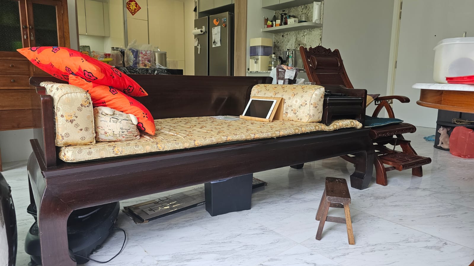 Before coming to us, the client used a Chinese antique-style daybed with an uncomfortably tall seating height that left their legs dangling. The seat cushion was also too thin and made long hours in front of the TV feel more like punishment than pleasure.