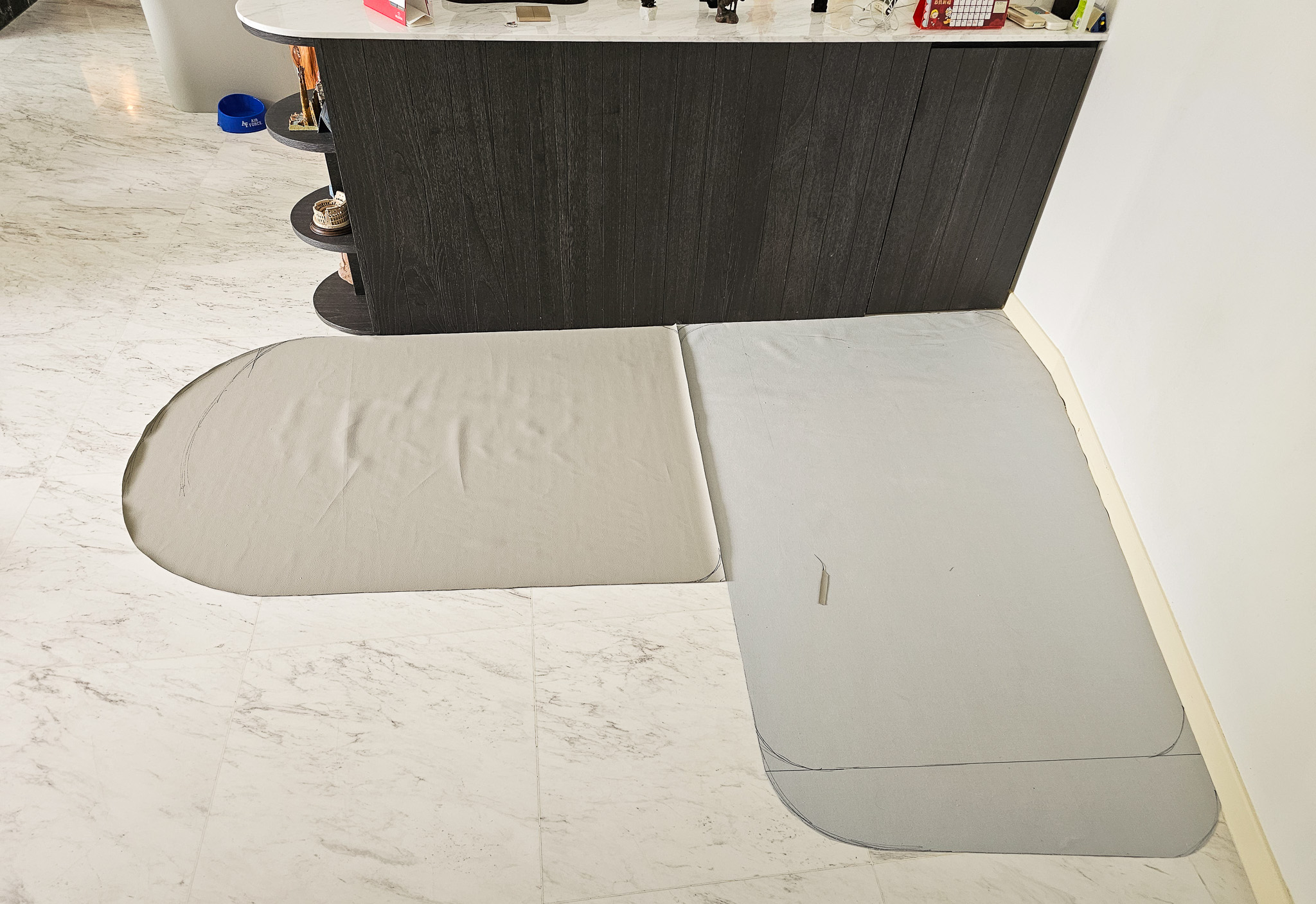 We visited the home with our usual tools: a fabric roll for templating, tape, and open ears. On the spot, we created a template that followed the room’s odd angles. We also discussed important questions: