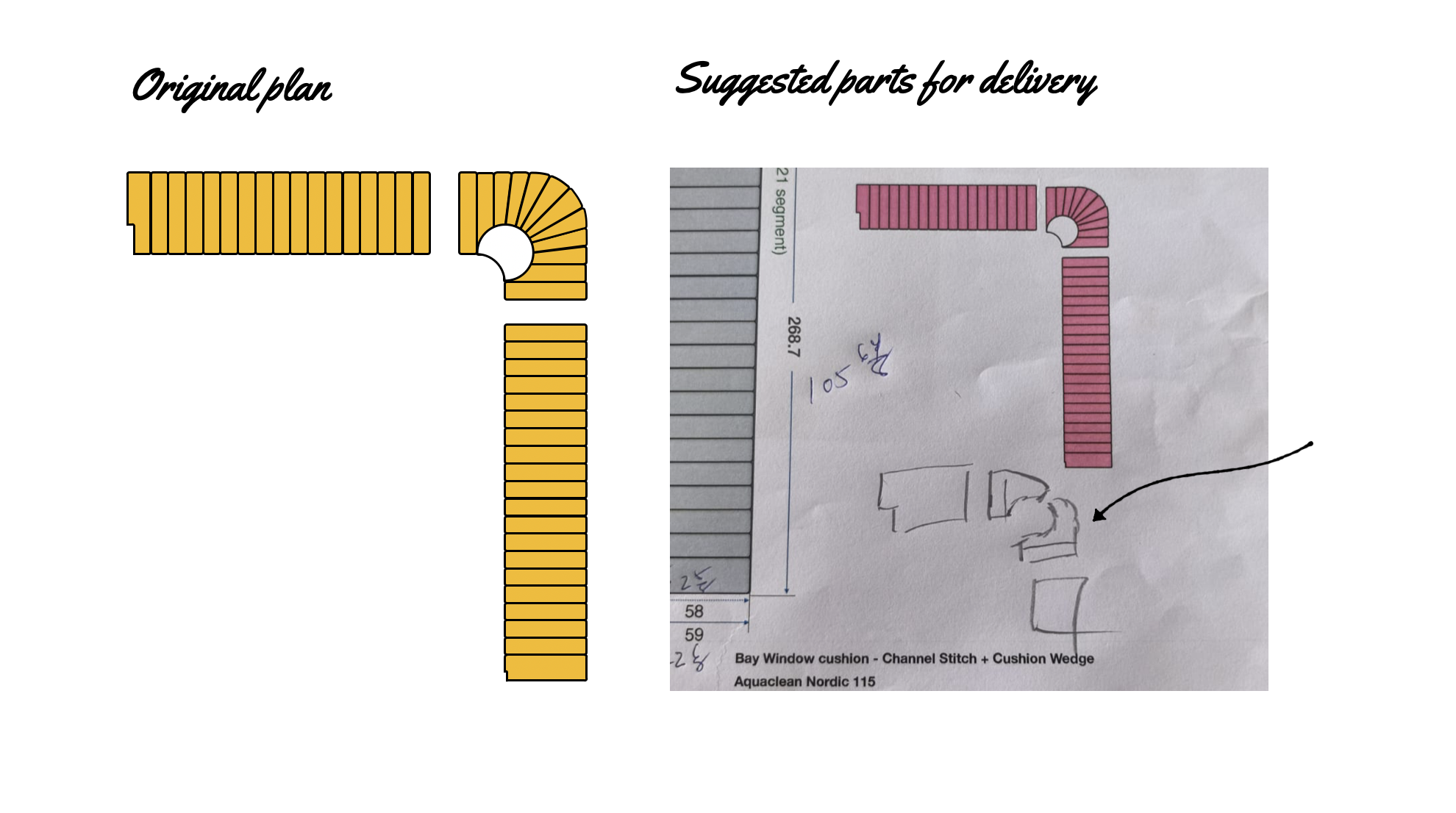 Originally, the plan was to stop the cushion before the round pillar. A clean break, simple execution. However, we strongly recommended extending the cushion around the pillar to give the bay window a more intentional and cohesive look.