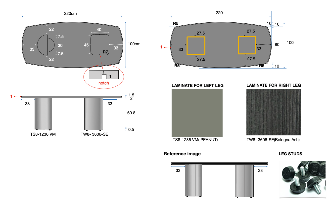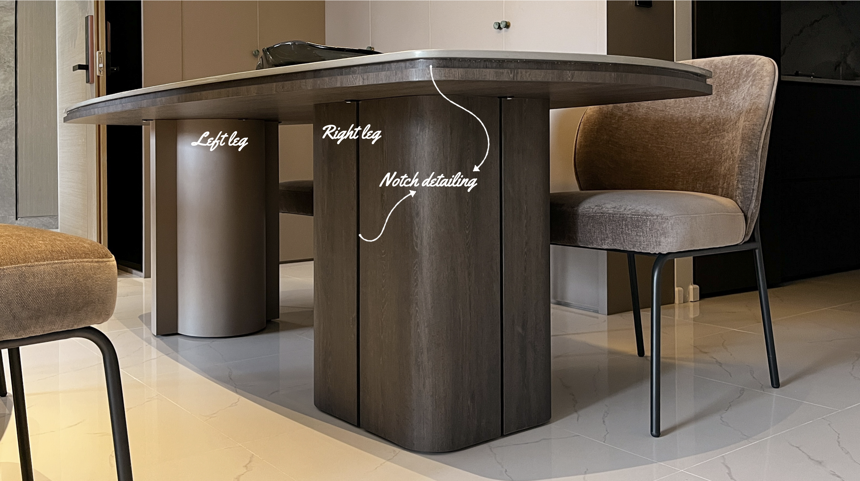 The base adds another layer of uniqueness. It includes two distinct leg designs: one inspired by our in-house collection and the other featuring custom notch detailing which mirrors the table’s connecting panel.