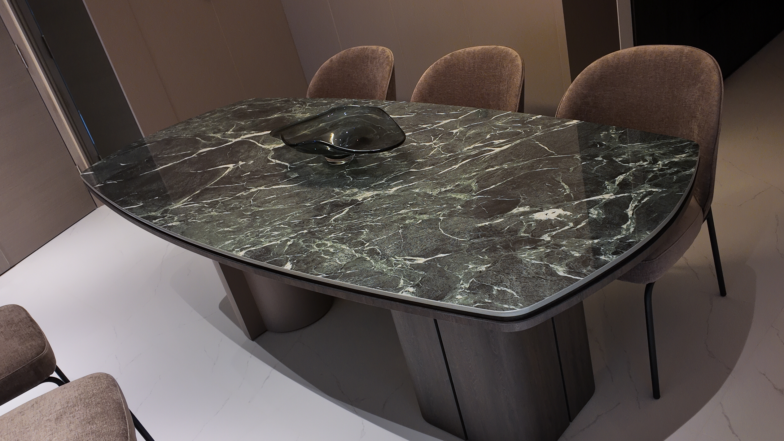 The boat shaped table measures 220 cm in length and 100 cm in width, making it a striking centrepiece. The top features a polished porcelain slab that mimics green marble with white spidery veins. It looks so realistic that you might mistake it for the real thing.
