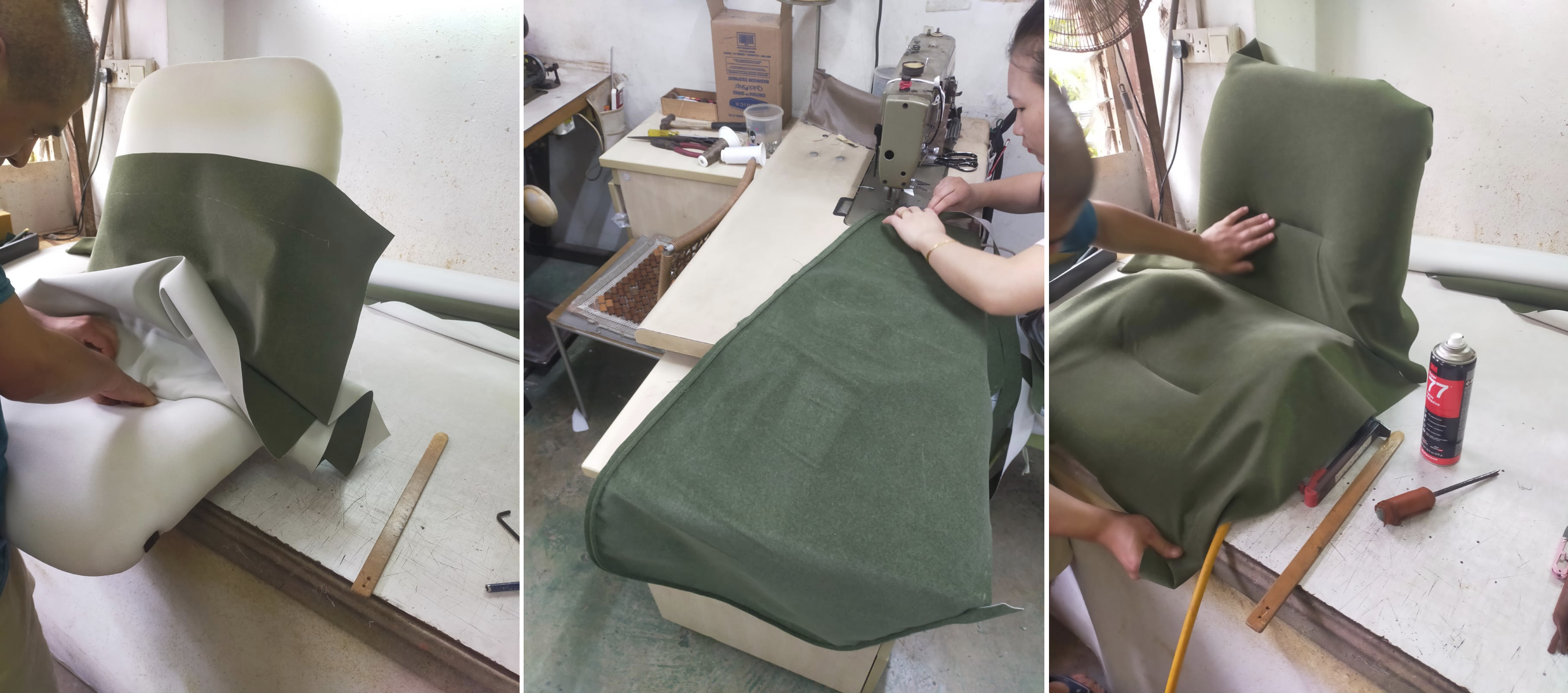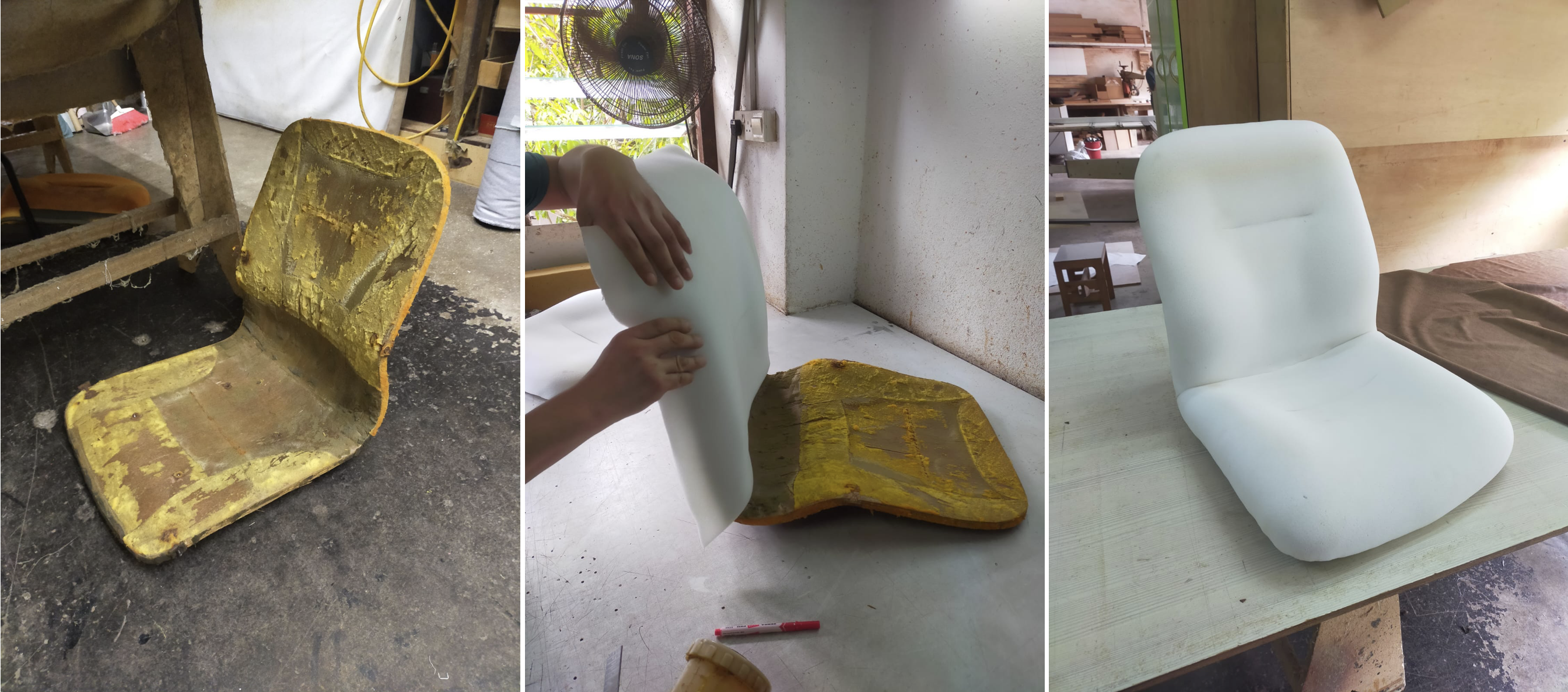 We started with stripping out the chair of its old fabric and old foam, leaving just its wood core which was still sturdy and in good condition!